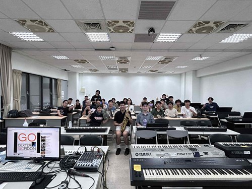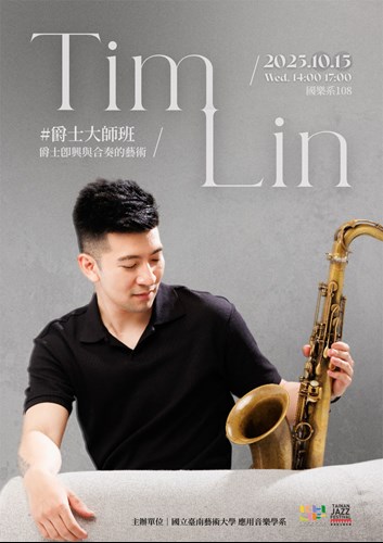 本次講座邀請到臺裔美籍爵士薩克斯風樂手−Tim Lin林偉庭老師,講座以探討爵士即興,介紹多種爵士歌曲及音階和弦的運用。老師分享了怎麼從古典樂手轉跑道變成一位專業的爵士樂手,一路走來得心路歷程,包括讀書歷程、為什麼熱愛爵士樂及爵士即興基本功如何練習等,再來以示範表演,讓同學們更深入的了解爵士即興,講座的最後與學生樂團互動並教授、指導演奏技巧,讓本次上課的同學收穫滿滿。
