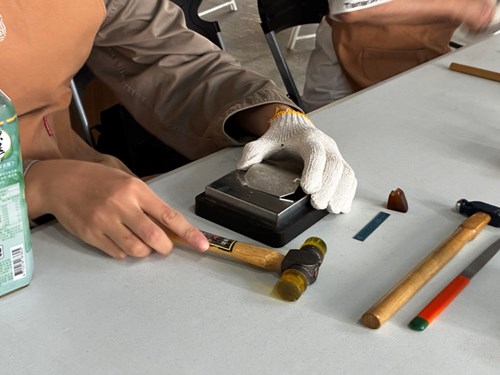下午的工作坊由來自花蓮的陶錫工藝主持。兩位創辦人皆畢業於本校博物館學與古物維護研究所,在學習與創作的階段逐漸確立自己想走進金屬工藝的創作方向,決定在花蓮玉里落腳,專注投入錫器創作。原以為搬到玉里後的生活會是遠離都市、安靜製作、踏實創作的節奏,沒想到卻意外與當地居民與生活場域有了深刻連結,甚至推展出比想像更多的合作與創作能量。