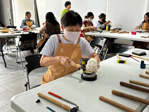 學員在操作過程中都相當投入。現場敲擊聲此起彼落,仔細打磨的姿態也讓空間出現一種手作特有的節奏。有人想把碟子做成盛醬用的小器皿,有人想把它當成桌上放小物的容器,也有人一邊敲、一邊從表面紋理尋找「這就是自己手工痕跡」的感覺。講師在旁巡視,時而分享技巧,時而替學員調整角度,讓每個人都能在實作中理解金屬如何在手裡慢慢成形。